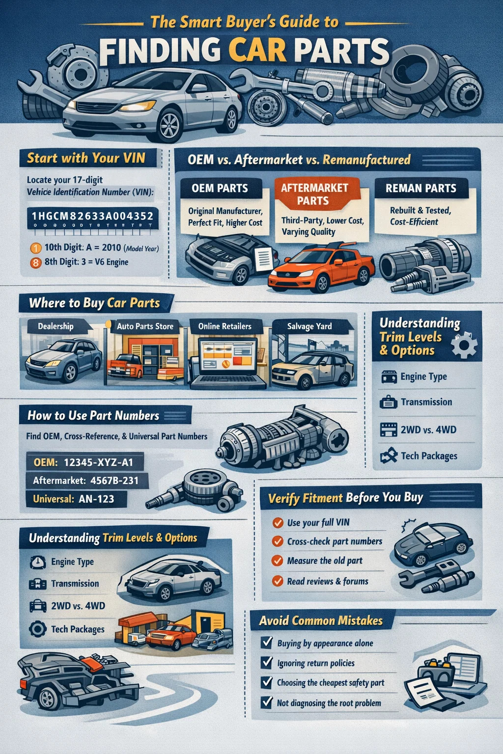 Het vinden van de juiste onderdelen voor uw auto komt neer op één niet-onderhandelbaar uitgangspunt: u moet het jaar, het merk, het model, de motorinhoud en het uitrustingsniveau van uw voertuig kennen voordat u ernaar zoekt auto onderdeel . Zonder deze informatie kan zelfs een onderdeel dat er identiek uitziet, niet goed passen of niet goed functioneren. Zodra u deze gegevens heeft vastgelegd, wordt het proces veel eenvoudiger, of u nu koopt bij een dealer, een online winkel, een bergingsbedrijf of een winkel voor auto-onderdelen. Deze gids doorloopt elke stap van dat proces met praktische details.