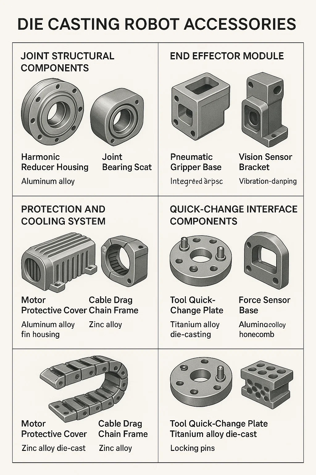 Accessoires voor spuitgietrobots zijn metalen kerncomponenten die zijn vervaardigd via een hogedrukgietproces. Ze voldoen aan de kernvereisten van industriële robots, waaronder precisie, lichtgewicht en duurzaamheid. De belangrijkste toepassingen en functies zijn als volgt: