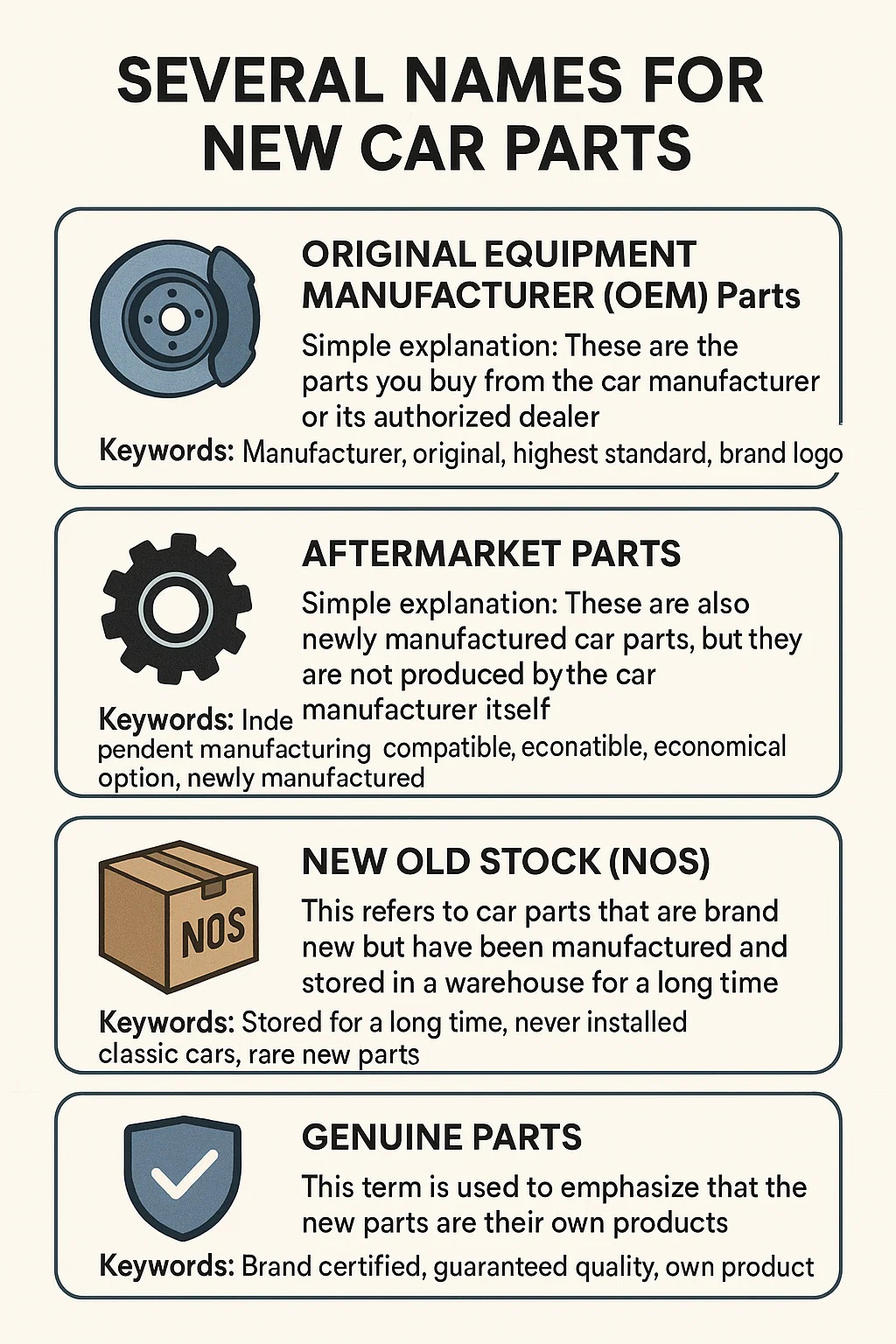 Gloednieuw auto onderdelen hebben verschillende veel voorkomende namen, die enigszins verschillen afhankelijk van hun bron en aard.