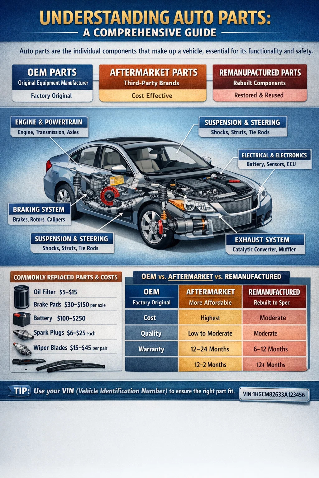 Op het meest fundamentele niveau vallen auto-onderdelen in twee brede categorieën: OEM-onderdelen (Original Equipment Manufacturer). en aftermarket-onderdelen . OEM-onderdelen worden geproduceerd door of voor de oorspronkelijke fabrikant van het voertuig en zijn identiek aan wat er af fabriek bij de auto werd geleverd. Aftermarket-onderdelen worden gemaakt door externe bedrijven en kunnen variëren in kwaliteit, prijs en pasvorm. Een derde categorie – gereviseerde of herbouwde onderdelen – verwijst naar gebruikte componenten die zijn gerestaureerd om aan de originele prestatiespecificaties te voldoen.